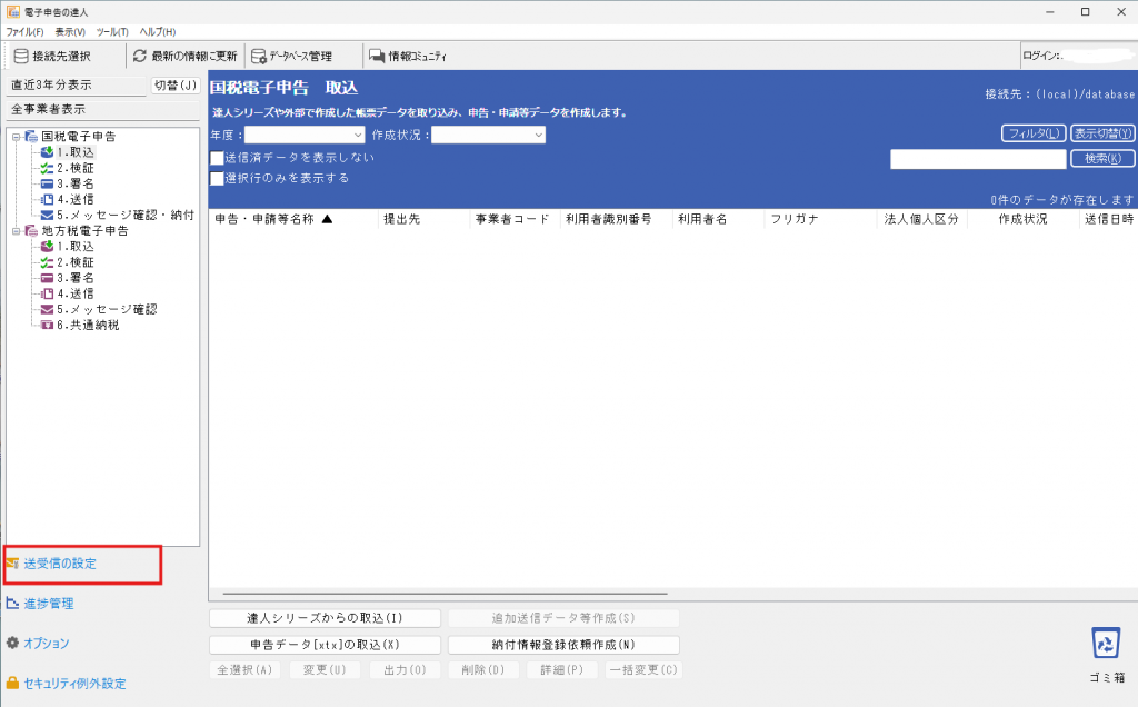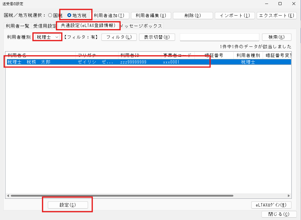 (1)送受信の設定画面から、「国税/地方税選択」で「地方税」を選択、「共通設定(eLTAX登録情報)」タブを開きます。