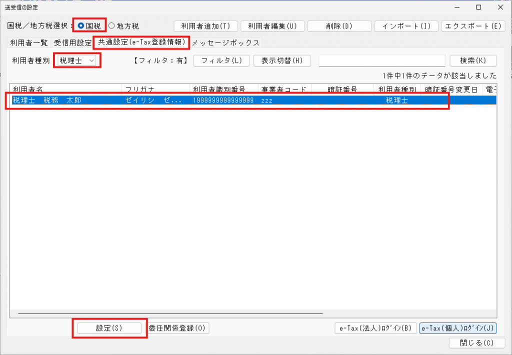 「利用者種別」を「税理士」にすると絞り込みができます。変更する利用者を選択したら、「設定」ボタンをクリックします。