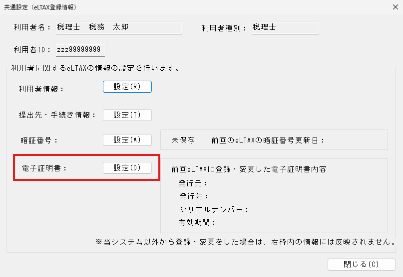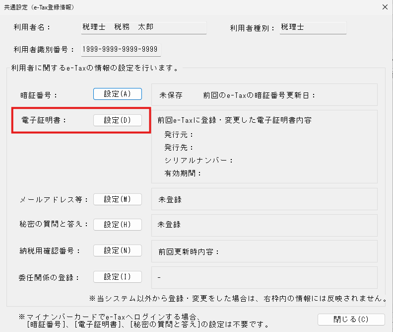 (3)「共通設定(e-Tax登録情報)」の画面が表示されるので、「電子証明書」の「設定」ボタンをクリックします。