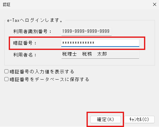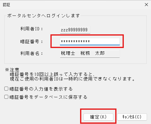 (4)「認証」画面が表示されるので、e-Taxへログインする際の「暗証番号」を入力して「確定」ボタンをクリックします。