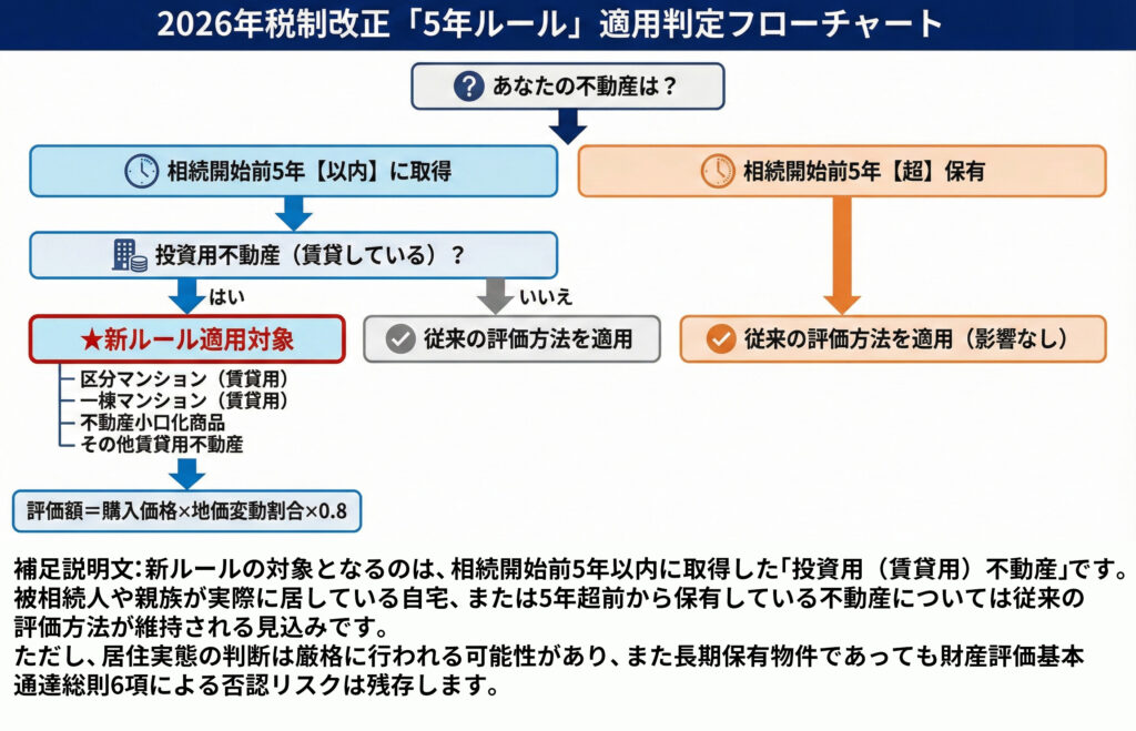 A. はい、対象となります。2024年の改正では居住用区分所有マンションのみが対象でしたが、2026年の改正案では「相続開始前5年以内に取得した賃貸用不動産すべて」が対象となる予定です。